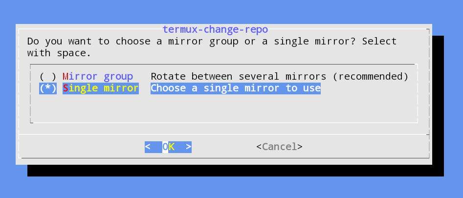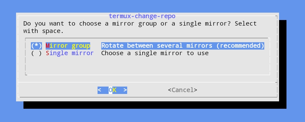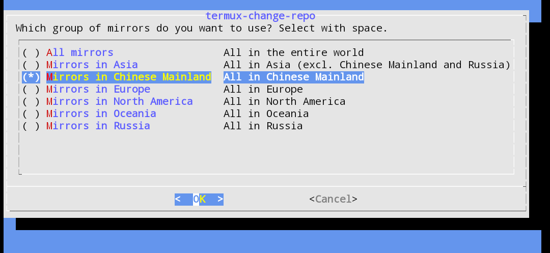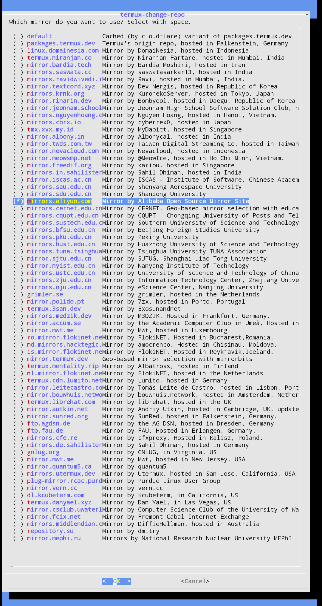 打开termux,输入termux-change-repo1.选择镜像组①选择第一个回车确认②选择第三个(Mirrors in Chinese Mainland),按空格选择并按回车确认2.选择单个镜像①选择第二个回车确认②以阿里云为例,选择并回车确认